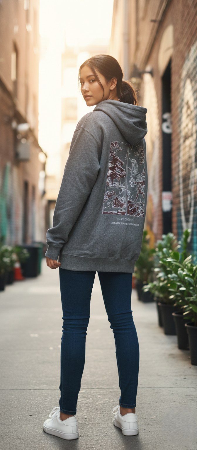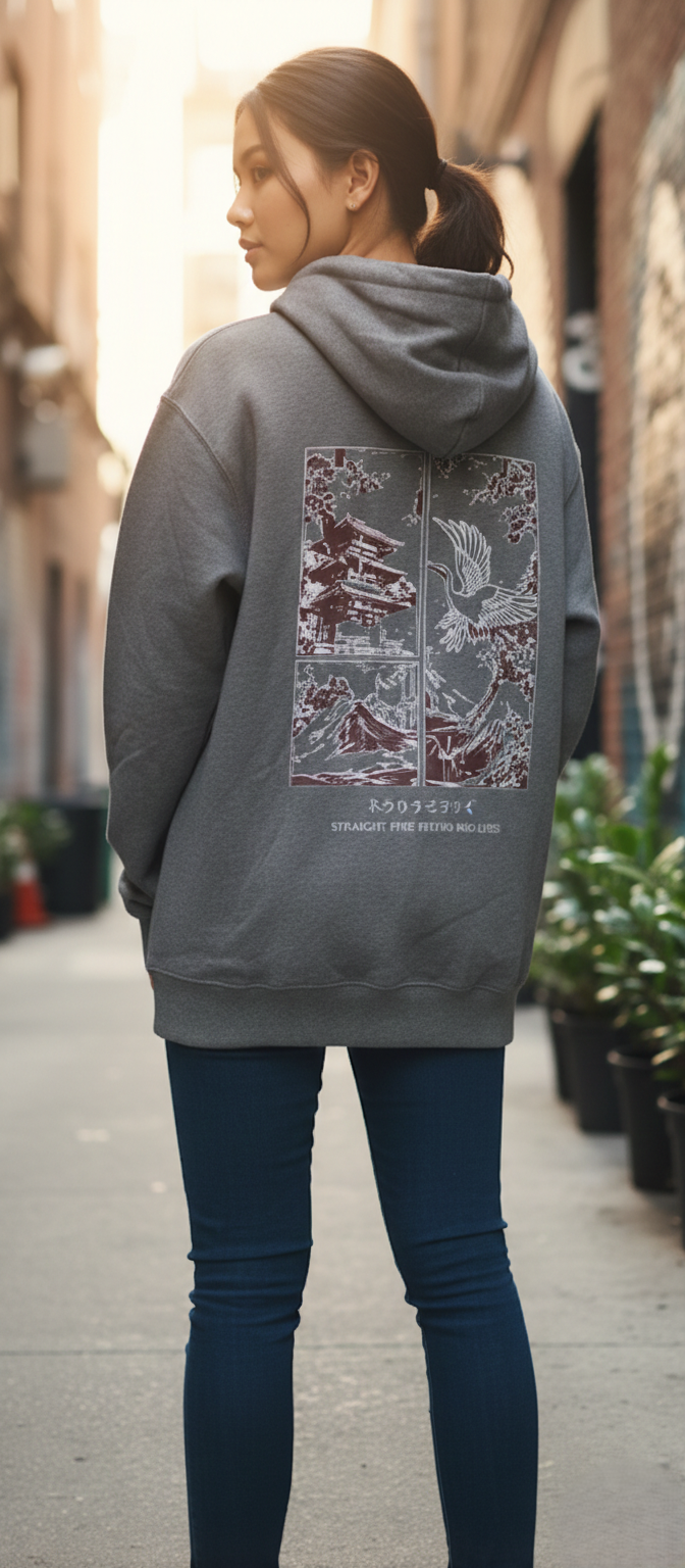 Intricate Back Graphic: Detailed Mt. Fuji, Japanese temple, aur iconic Crane bird ka design, jo vintage aesthetics ko modern streetwear style mein pesh karta hai.