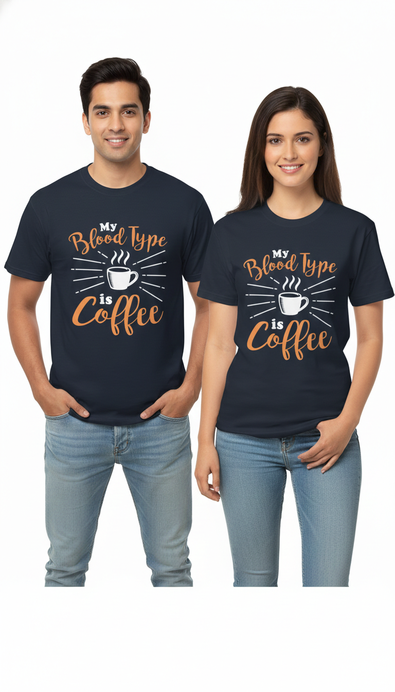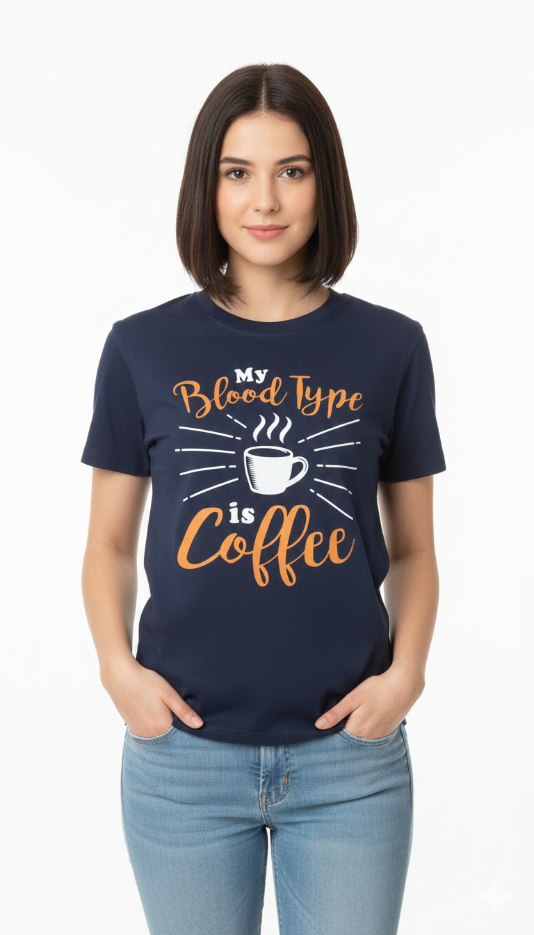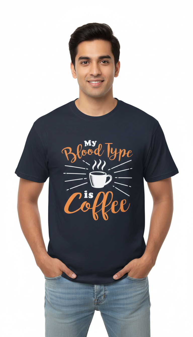 Playful Coffee Typography: "My Blood Type is Coffee" ka attractive font aur steaming cup graphic jo dur se hi standout karta hai.
