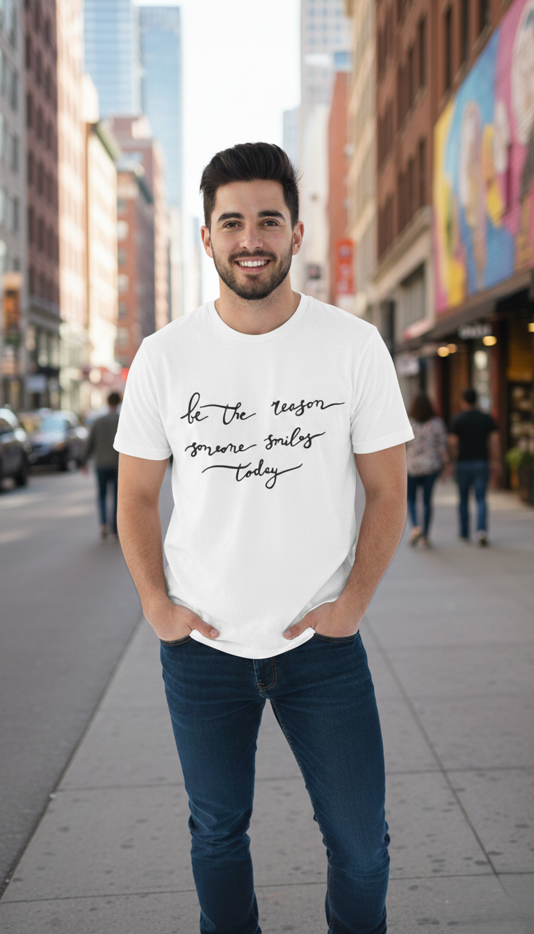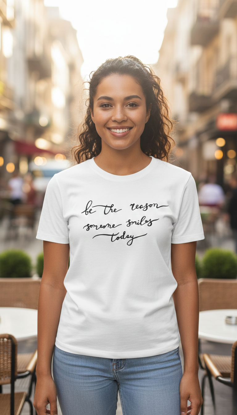 Handwritten Script Design: "Be the reason someone smiles today" ka elegant black print jo minimalist streetwear lovers ki pehli pasand hai.